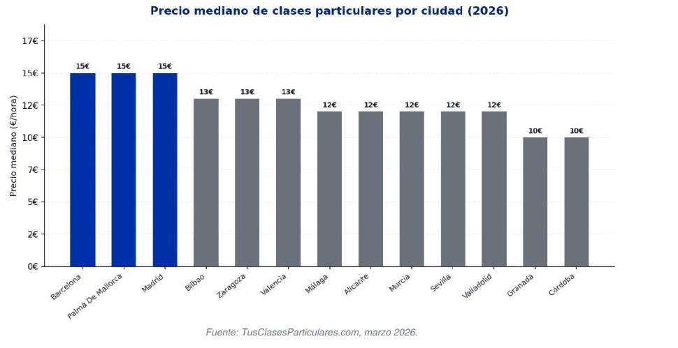 Barcelona, Palma de Mallorca y Madrid son las ciudades con los precios más altos, con una mediana de 15 €/hora. Bilbao, Zaragoza y Valencia se sitúan en 13 €/hora. Las opciones más competitivas son Córdoba y Granada, ambas con una mediana de 10 €/hora.