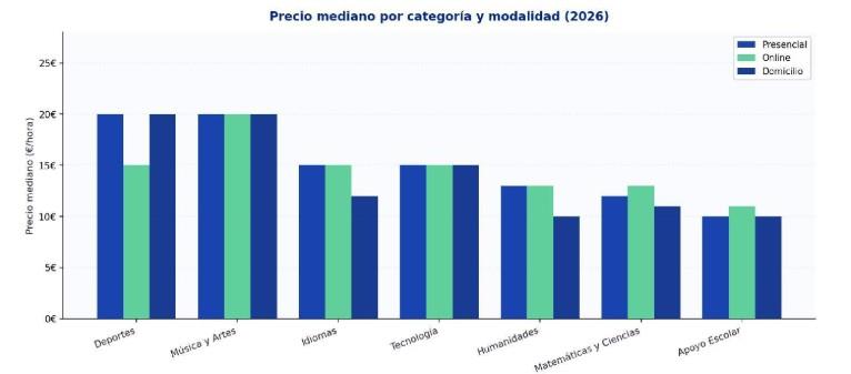 Precio mediano por categoría y modalidad (2026). Fuente: TusClasesParticulares.com