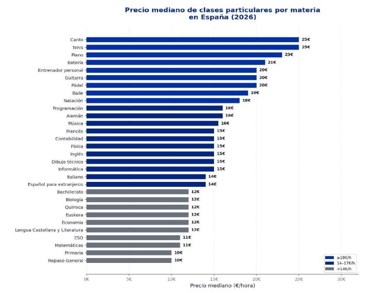 Las materias más caras son las actividades deportivas y artísticas: Canto y Tenis (25 €/h), Piano (23 €/h) y Batería (21 €/h). Las más asequibles son Primaria y Repaso General (10 €/h), seguidas de Matemáticas y ESO (11 €/h).